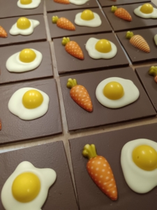 Chez Castan Chocolatier, les préparatifs de Pâques se déroulent sous votre nez, et sous vos yeux ! Depuis l’atelier, ouvert sur le fond de la boutique, notre équipe s’affaire en ce moment-même à la réalisation de médaillons en chocolat, représentant un duo de poissons et un délicat œuf au plat accompagné de sa petite carotte. Derrière leur apparente simplicité, ces créations sont le fruit d’un savoir-faire artisanal de grande qualité. Il s’agit de pièces exclusives à la Maison que vous ne trouverez nulle part ailleurs (souvent imitée, jamais égalée) !