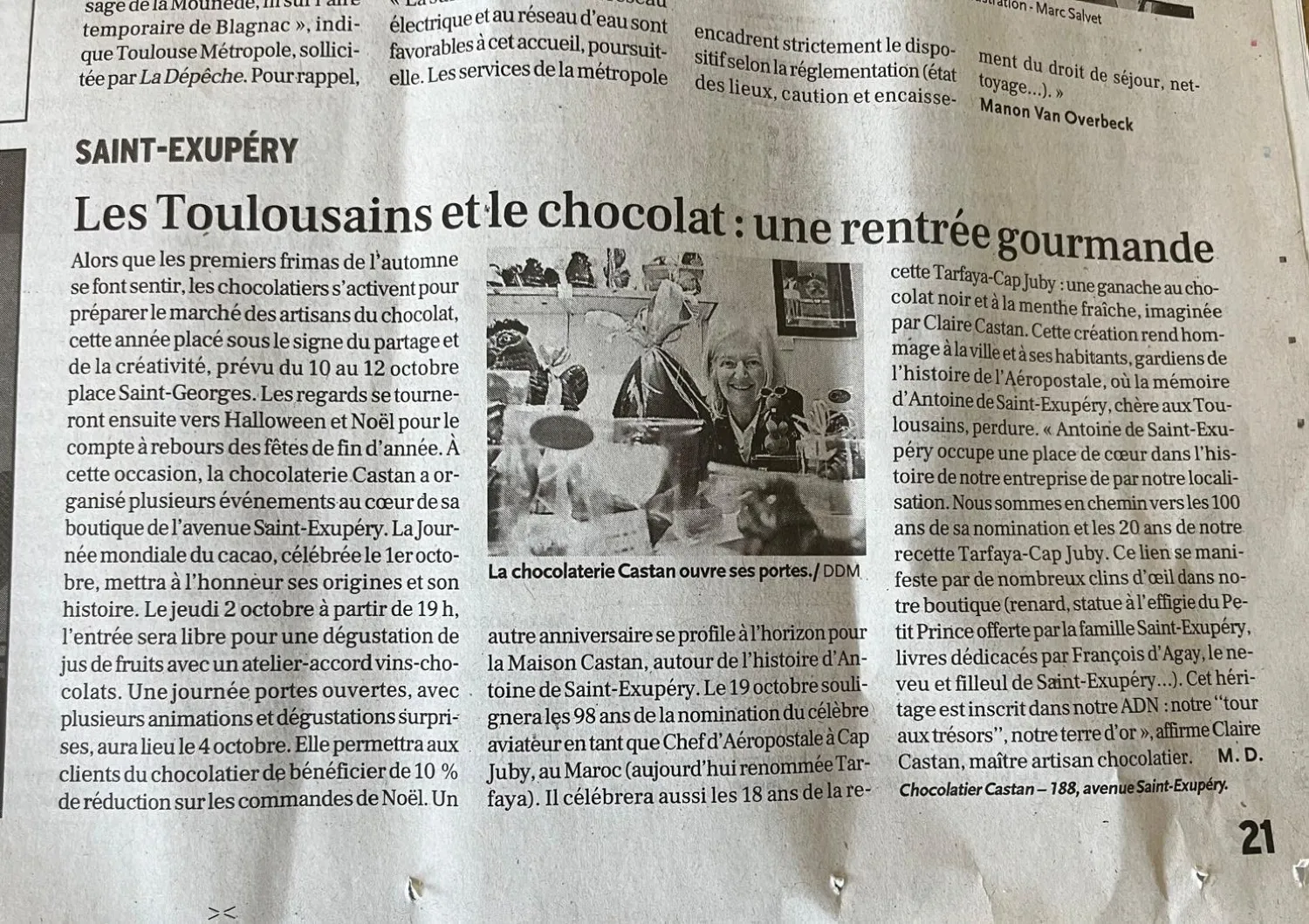 Chez les Castan, la passion pour le chocolat se transmet de père en fille, depuis 1989. Aujourd’hui épaulée par toute son équipe, Claire Castan, Maître Artisan – chocolatier, perpétue l’art du beau geste, répondant à une savante mécanique de précision, de finesse et d’élégance.