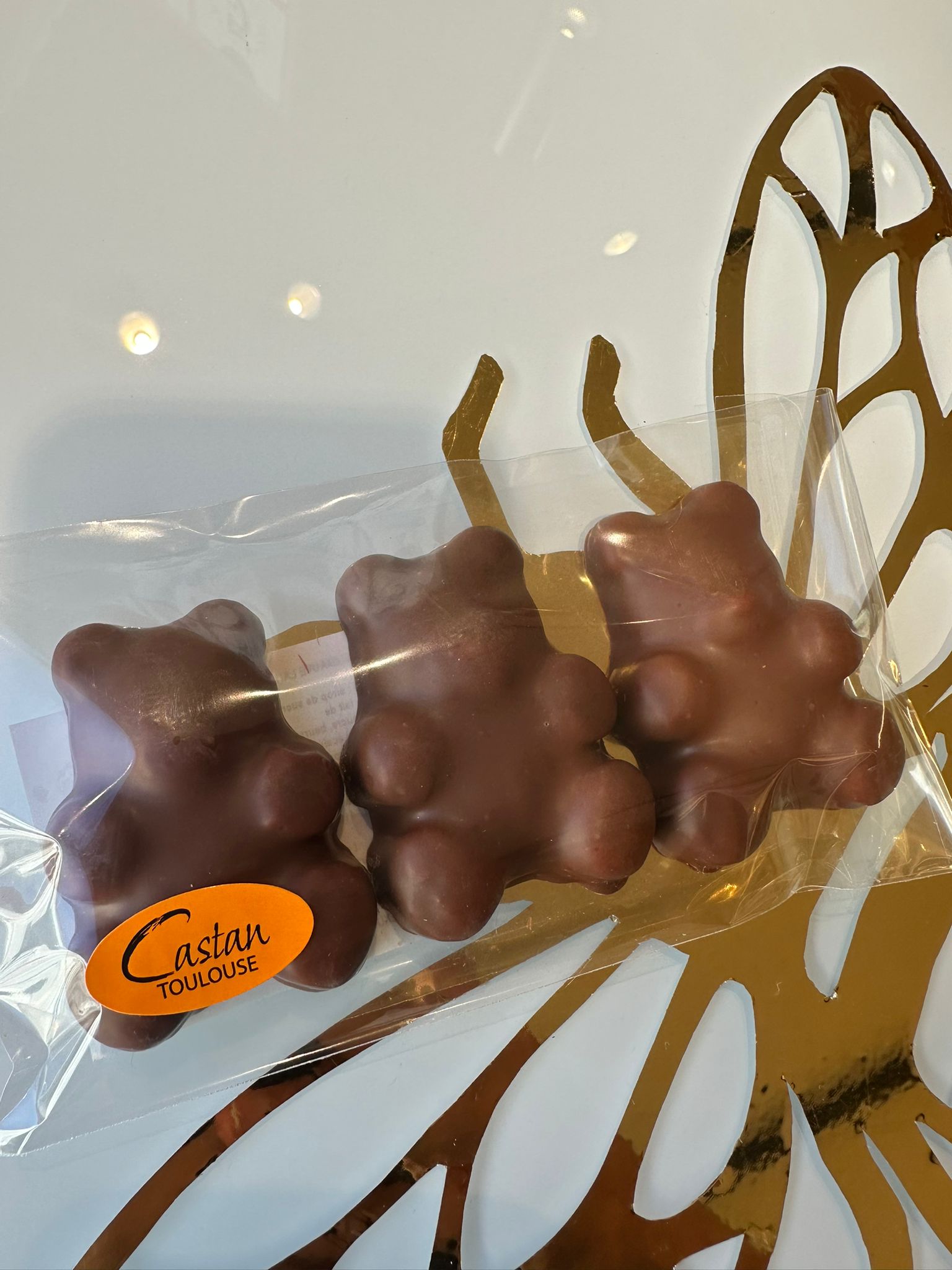 Enrobage: Chocolat lait ghana 43% cacao ( sucre, beurre de cacao, poudre de lait entier, fèves de cacao, émulsifiant: lécithine de tournesol).